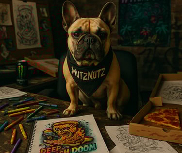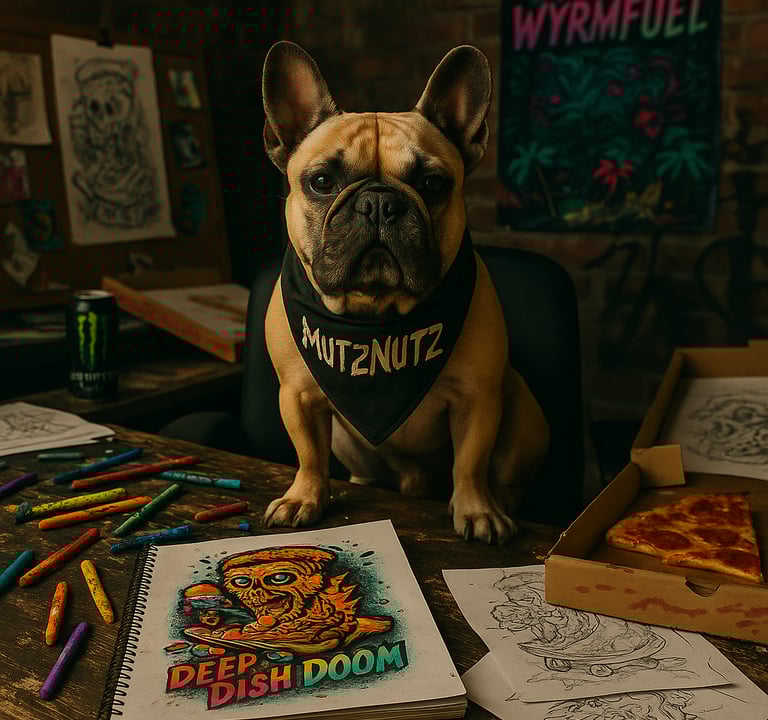 ‘Deep Dish Doom’ wasn’t designed — it erupted. Leo dropped mustard on his sketchpad, got mad, then drew a screaming pizza skull to vent. Maze walked in, said “that’s disgusting, I love it,” and the rest is trashy, delicious history.